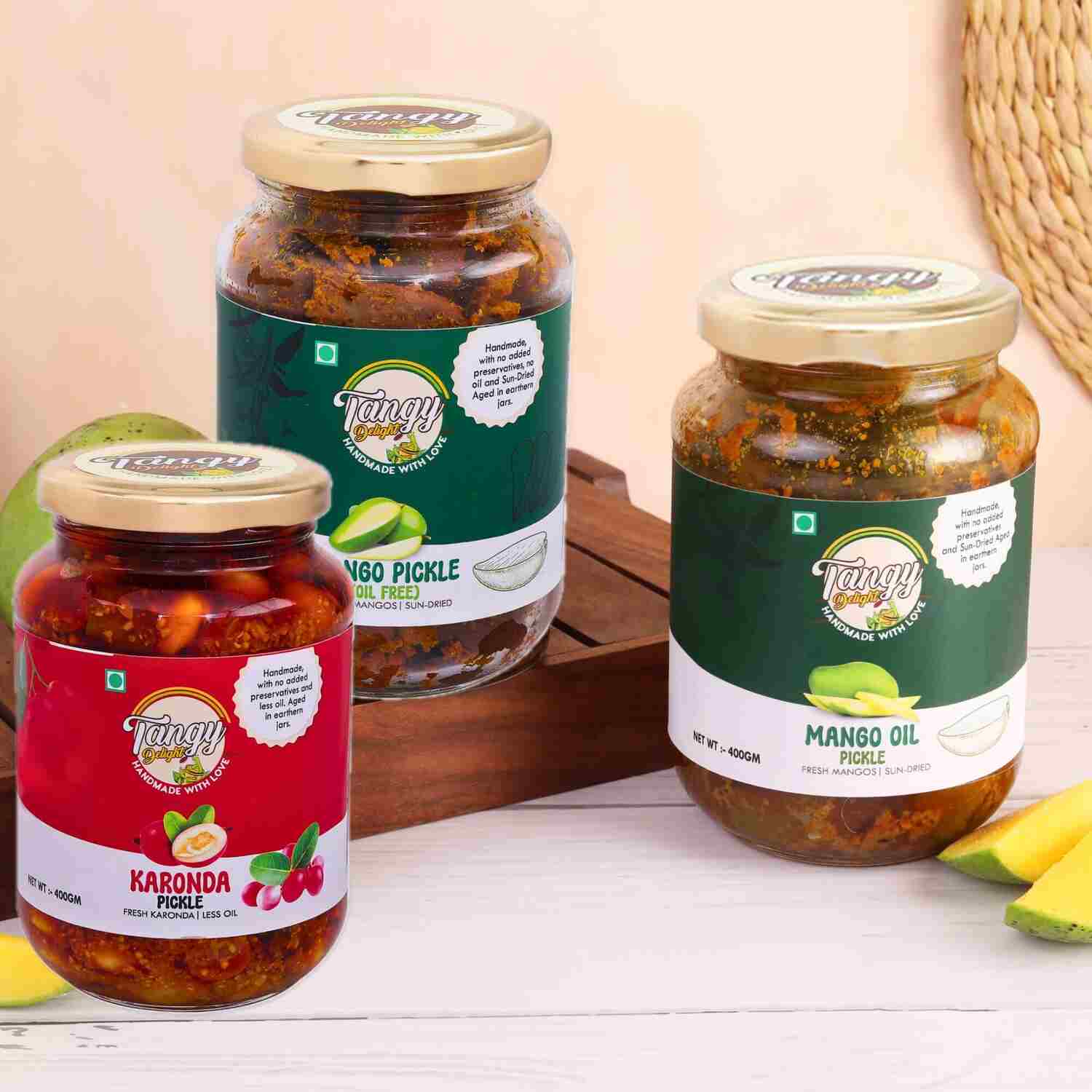 - Tangy Delight Mango Pickle (Oil-Free): Relish the zesty taste of sun-dried raw mangoes, marinated in spices and preserved without oil for a lighter, yet equally tasty, pickle.